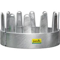 Die Rundraufe für Pferde verhindert durch die Blechverkleidung kritischer Zwischenräume ein Verfangen der Tiere im Fressgitter. Aussparungen im oberen Bereich der Palisadenbögen ermöglichen einen hängenden Transport der Raufe.